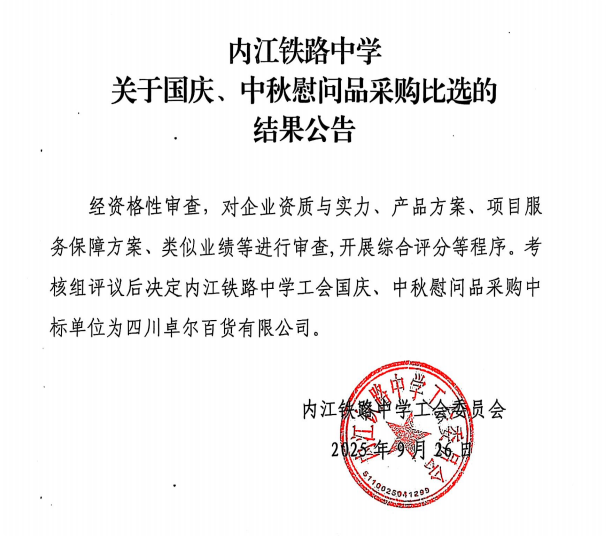 内江铁路中学关于国庆、中秋慰问品采购比选的结果公告