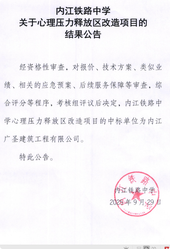 内江铁路中学关于心理压力释放区改造项目的 结果公告