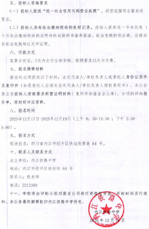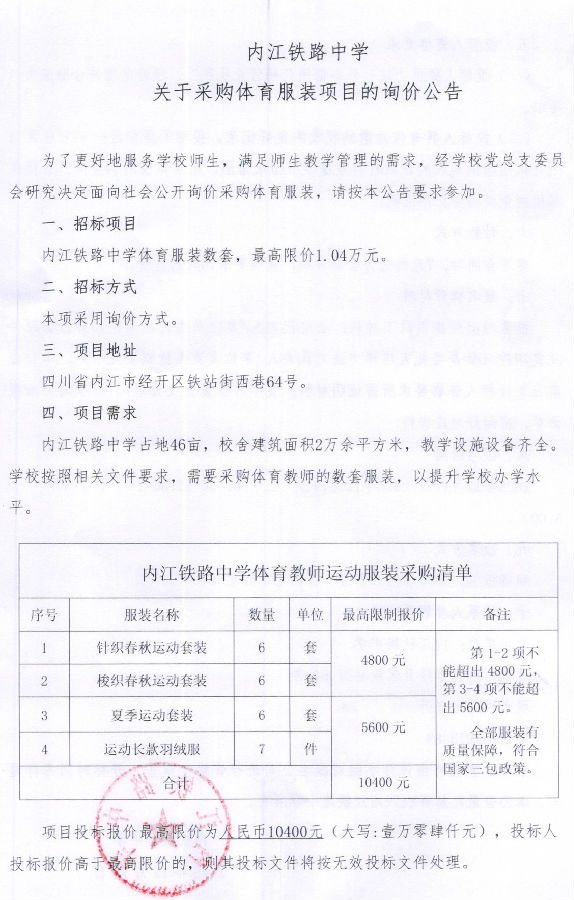 关于采购体育服装项目的询价公告